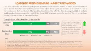 Loadshed regime for KE’s service territory has experienced no significant change following a routine review of the company’s network of over 2,000 feeders. The last review was conducted in September 2023. The latest schedule is published on the company’s website and is effective from January 01, 2024. Customers can also check for their latest updates via the KE Live App and KE WhatsApp service.