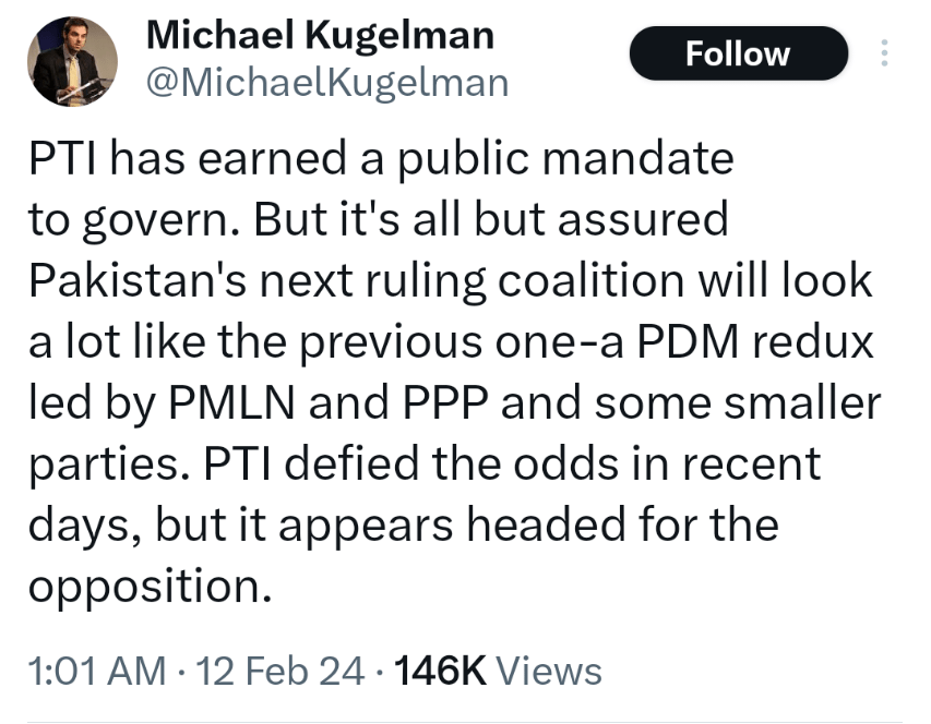 In a thread on X (formerly Twitter), Kugelman opined that while the Pakistan Tehreek-e-Insaf (PTI) secured a mandate to govern, the next ruling coalition is expected to resemble the previous one, led by the Pakistan Muslim League-Nawaz (PML-N) and the Pakistan Peoples Party (PPP), alongside smaller parties.