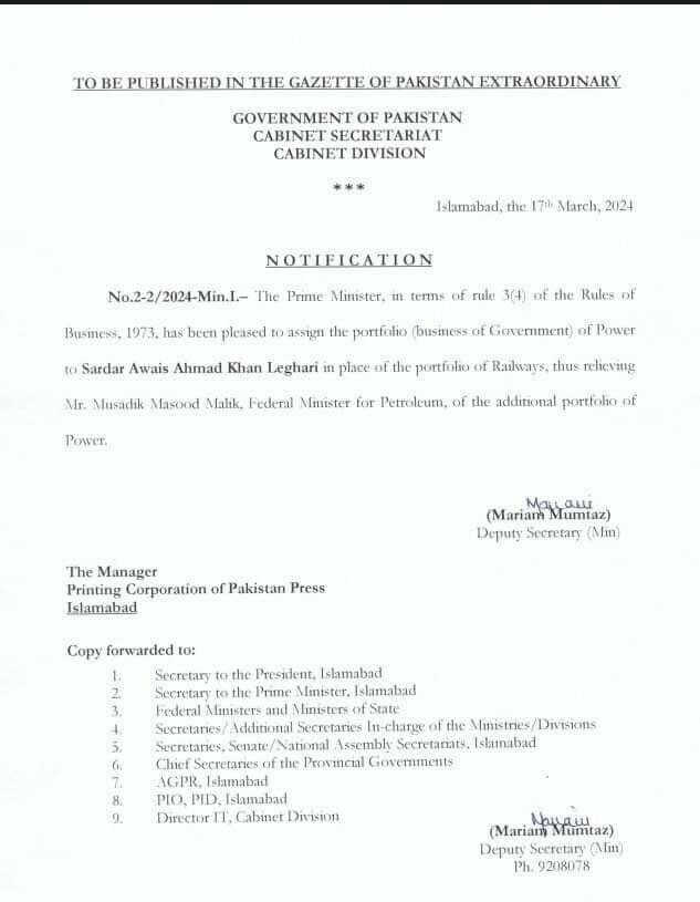 A notification issued by the Cabinet Division disclosed the change, indicating that Musadik Masood Malik, who recently assumed the additional portfolio of Power, would be succeeded by Leghari.