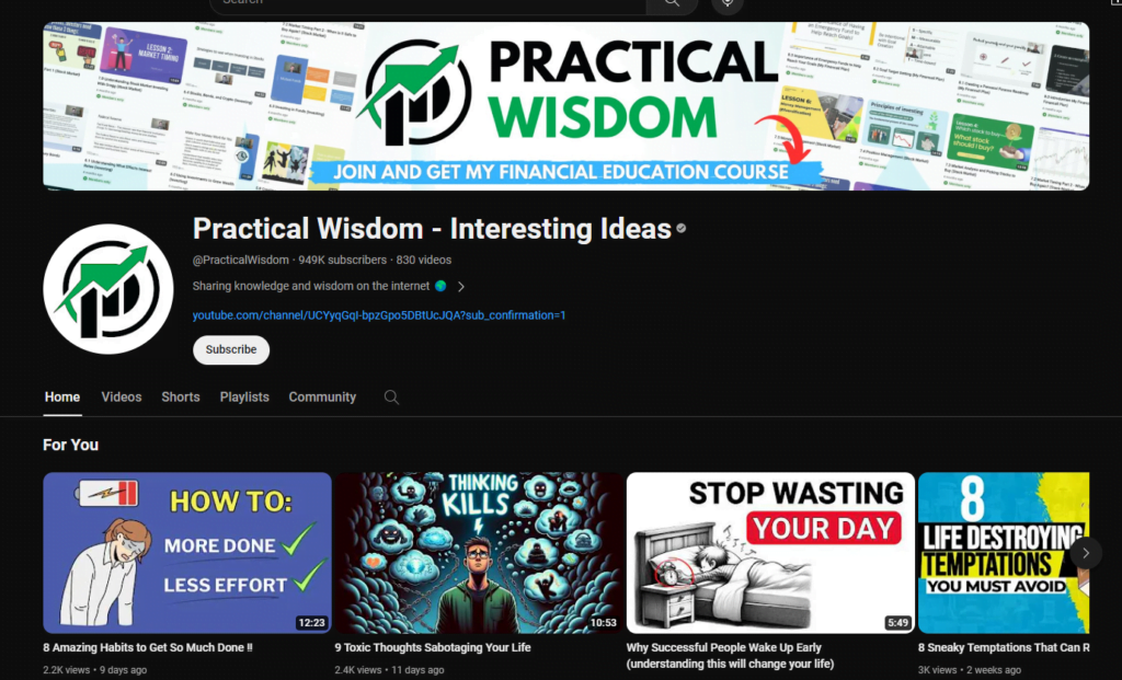 Take, for instance, the Practical Wisdom channel’s most-viewed video, amassing a staggering 9.8 million views. Assuming a conservative CPM of $35, the potential earnings from this single video could surpass $300,000.