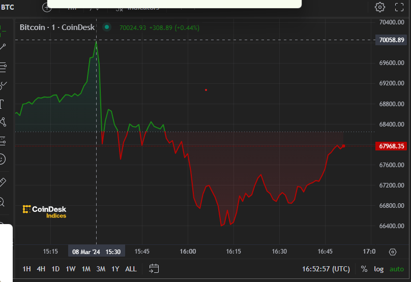 However, the price quickly retreated, with bitcoin last trading at $68,317.72.