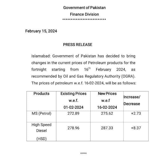 A notification by the finance ministry stated that petrol will now be priced at Rs275.62 per litre from February 16, while HSD will cost Rs287.33 per litre.