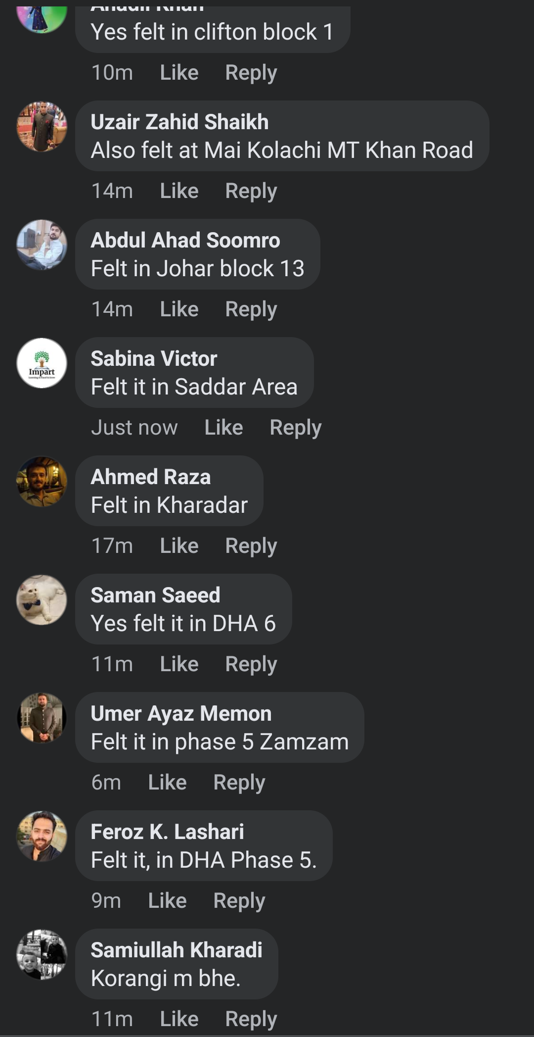 Tremors were felt in various areas including Landhi, Korangi, Clifton, DHA Phase II, Old City area, and II Chundrigarh Road.