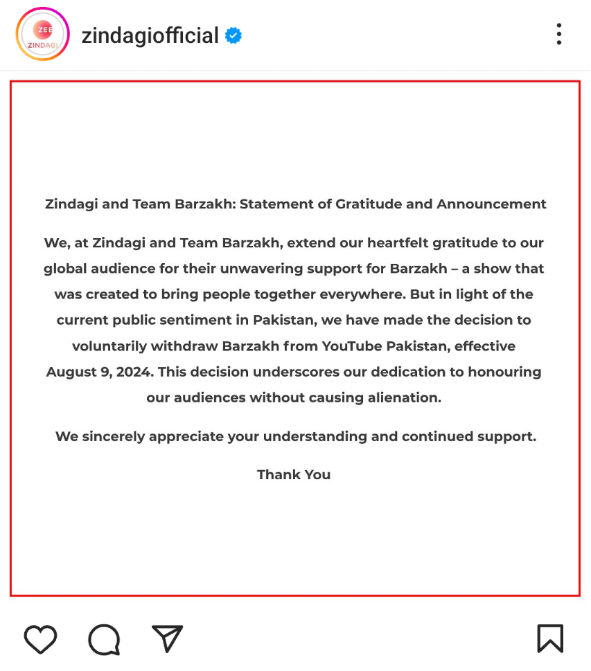In an Instagram post, Zindagi expressed gratitude to its global audience for their support, stating, “We, at Zindagi and Team Barzakh, extend our heartfelt gratitude to our global audience for their unwavering support for Barzakh — a show that was created to bring people together everywhere. But in light of the current public sentiment in Pakistan, we have decided to voluntarily withdraw Barzakh from YouTube Pakistan, effective August 9, 2024. This decision reflects our dedication to honouring our audiences without causing alienation. We sincerely appreciate your understanding and continued support. Thank You.”