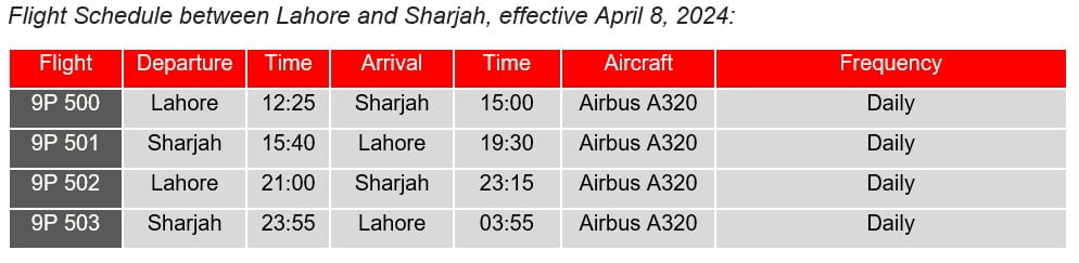 - 9P 500 Lahore 12:25 Sharjah 15:00 Airbus A320 Daily