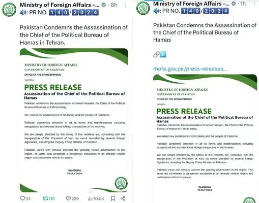 On Thursday, social media users expressed surprise after the Foreign Office revised its statement regarding the assassination of Ismail Haniyeh, the Hamas Political Bureau Chief. Haniyeh was killed in Tehran on July 31, an attack attributed to Israel.