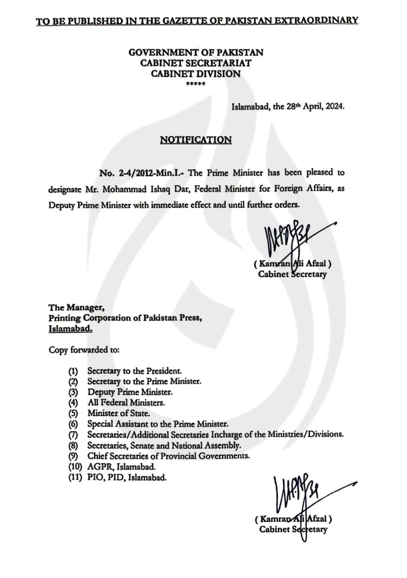 The federal government has designated Foreign Minister Ishaq Dar as the deputy prime minister “with immediate effect,” as per an official notification issued on Sunday.