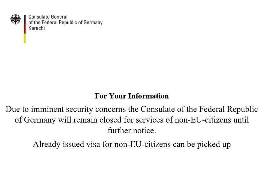 The German Consulate in Karachi has announced a temporary suspension of its services for non-EU citizens due to imminent security concerns.