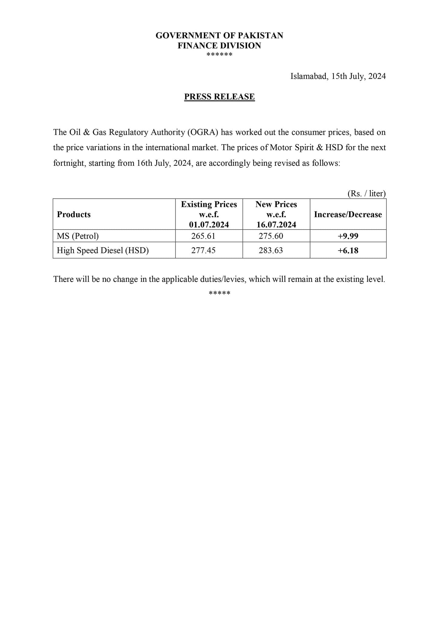 According to a statement from the Finance Division, the price of high-speed diesel (HSD) has been increased by Rs6.18 per litre, now costing Rs283.63 per litre.