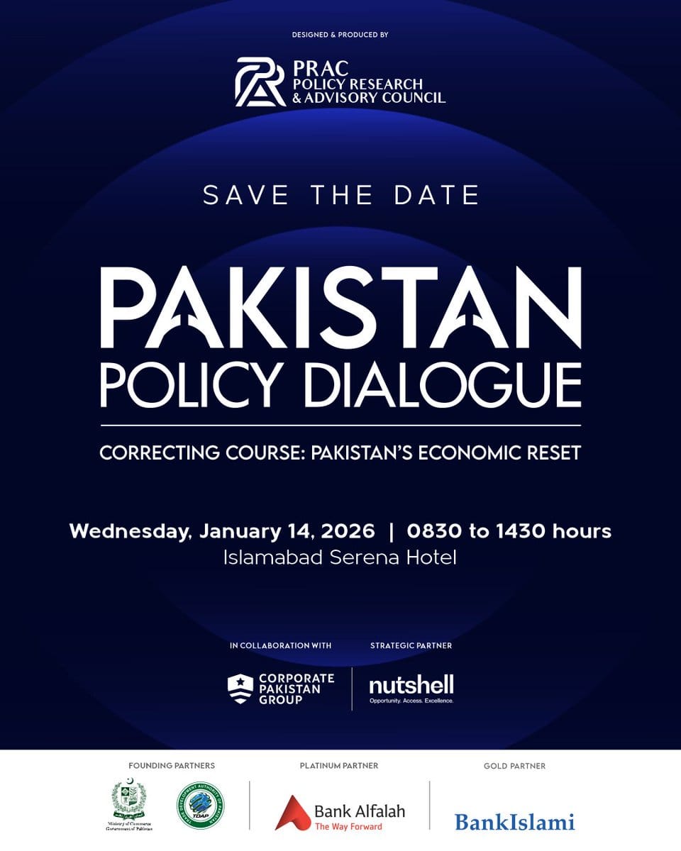 The event is being organised under the theme **“Correcting Course: Pakistan’s Economic Reset”** by the Policy Research and Advisory Council in collaboration with the Corporate Pakistan Group. The Ministry of Commerce and the Trade Development Authority of Pakistan are the founding partners, with support from Bank Alfalah, BankIslami and the Nutshell Group.