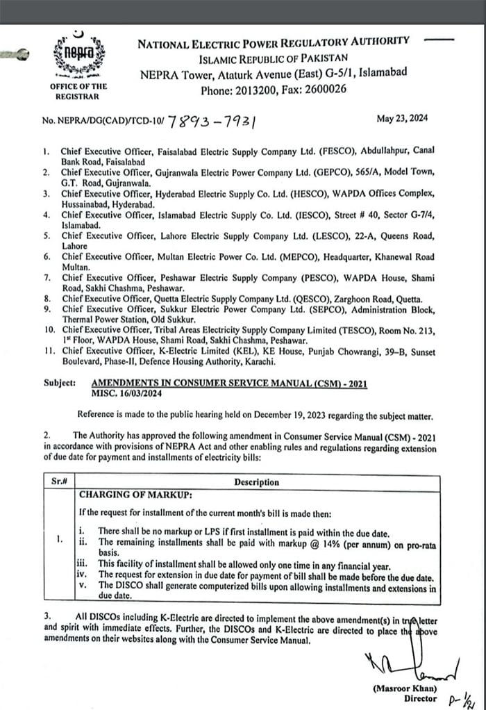 Furthermore, power distribution companies (Discos) are instructed to issue computerized bills to facilitate instalment plans and deadline extensions.