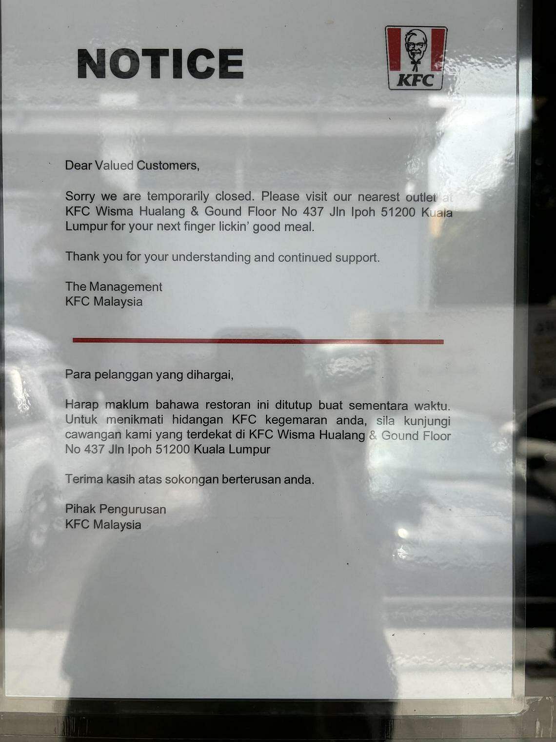 The closure affects 108 outlets of the American fast-food chain, with Kelantan state bearing the brunt as nearly 80 percent of its stores, totaling up to 21 outlets, are affected.