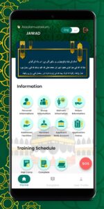 The app provides a comprehensive range of information, including personal details, group information, Mehram details, helper information, additional facilities, Hajj dues, nominee details, bank account information, and training schedules. Pilgrims can access flight details, accommodation information for Makkah and Madinah, and a platform for submitting complaints, requests, and inquiries.