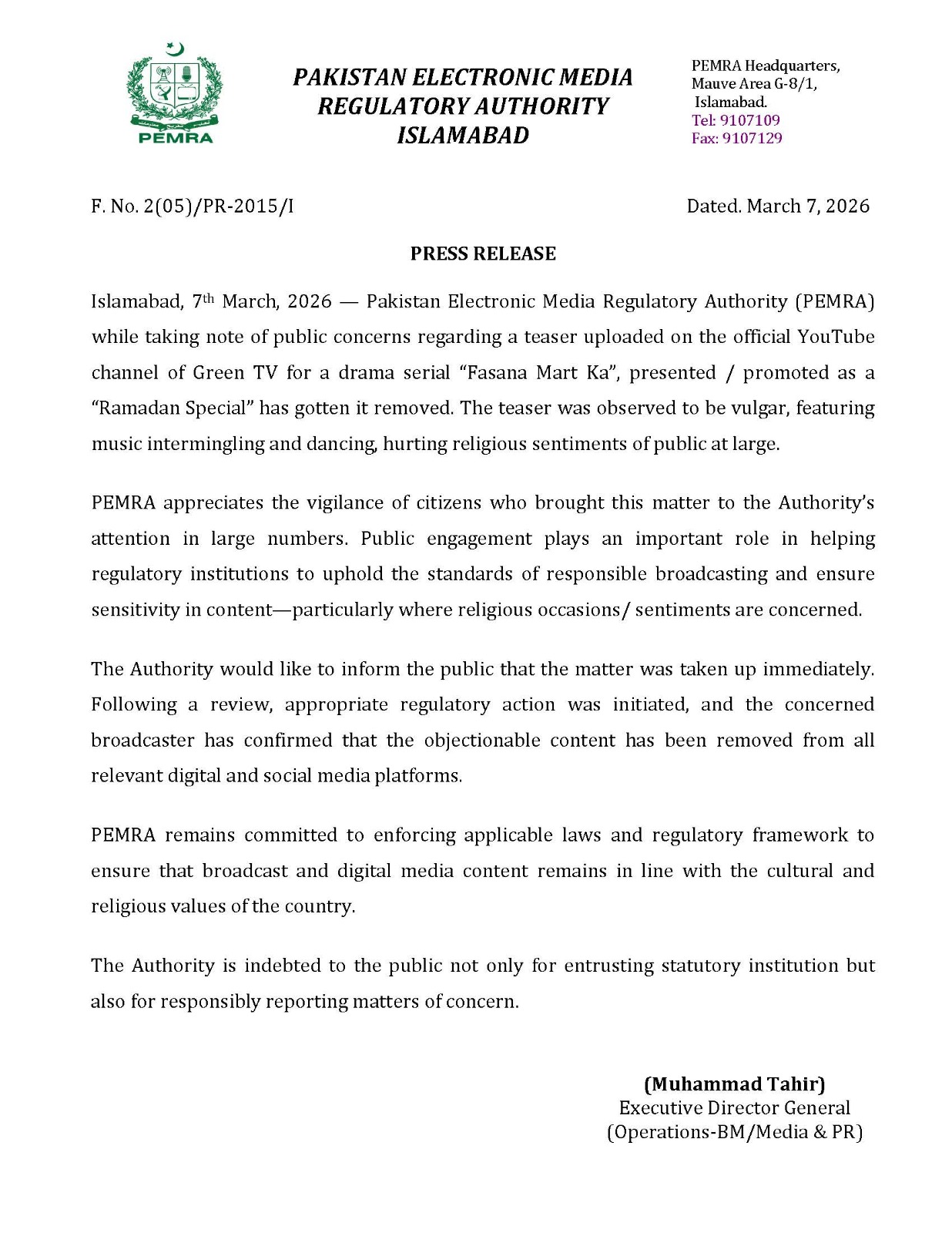 The regulatory body stated that the matter was addressed promptly, and appropriate regulatory action was initiated following a review. PEMRA reaffirmed its commitment to enforcing applicable laws and regulatory frameworks to ensure that both broadcast and digital media content remain consistent with Pakistan’s cultural and religious values.