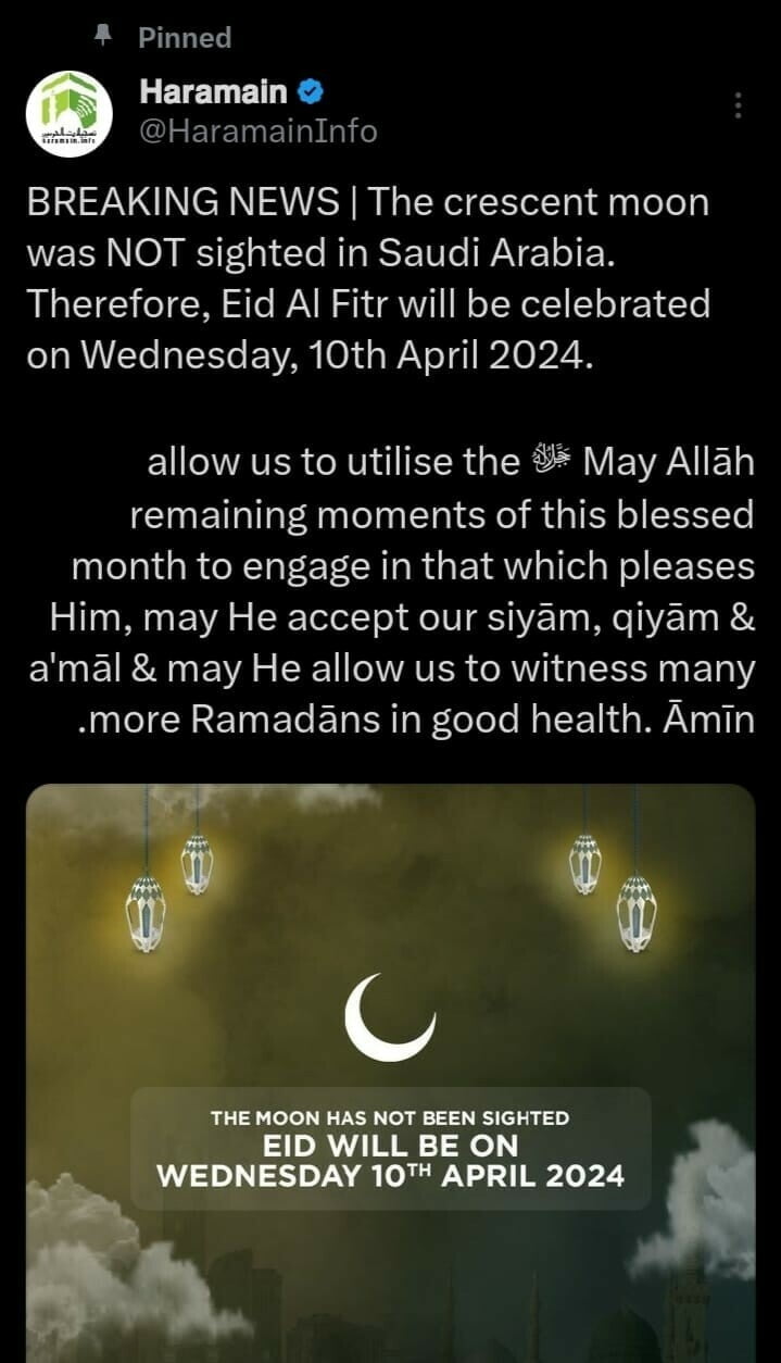 Saudi Arabia and the United Arab Emirates (UAE) announce Wednesday, April 10, as the first day of Eid-ul-Fitr 2024, as the Shawwal moon was not sighted on Monday evening.