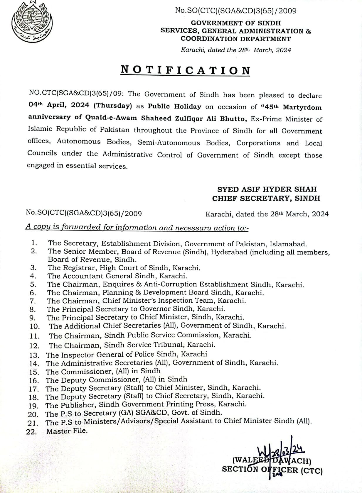 The Sindh government made an official announcement on Thursday, declaring April 4 as a public holiday in commemoration of the death anniversary of former Prime Minister and late Pakistan Peoples Party (PPP) founder, Zulfikar Ali Bhutto.