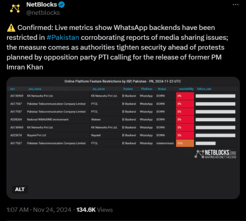“Live metrics show WhatsApp backends have been restricted in #Pakistan corroborating reports of media sharing issues,” NetBlocks stated, attributing the move to enhanced security measures ahead of the demonstrations.